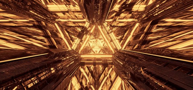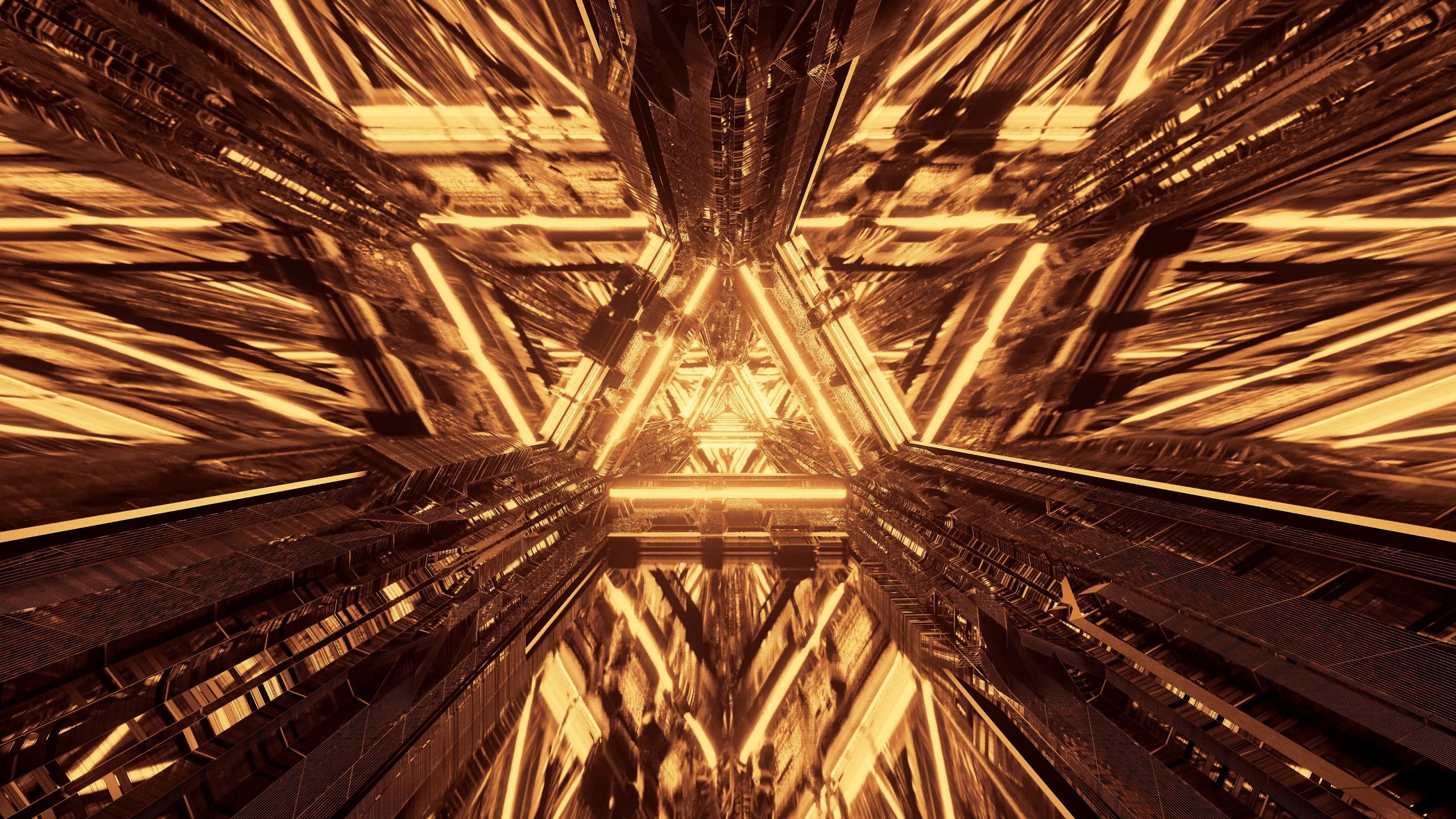 Several lights forming triangular patterns and flowing forward behind a dark background